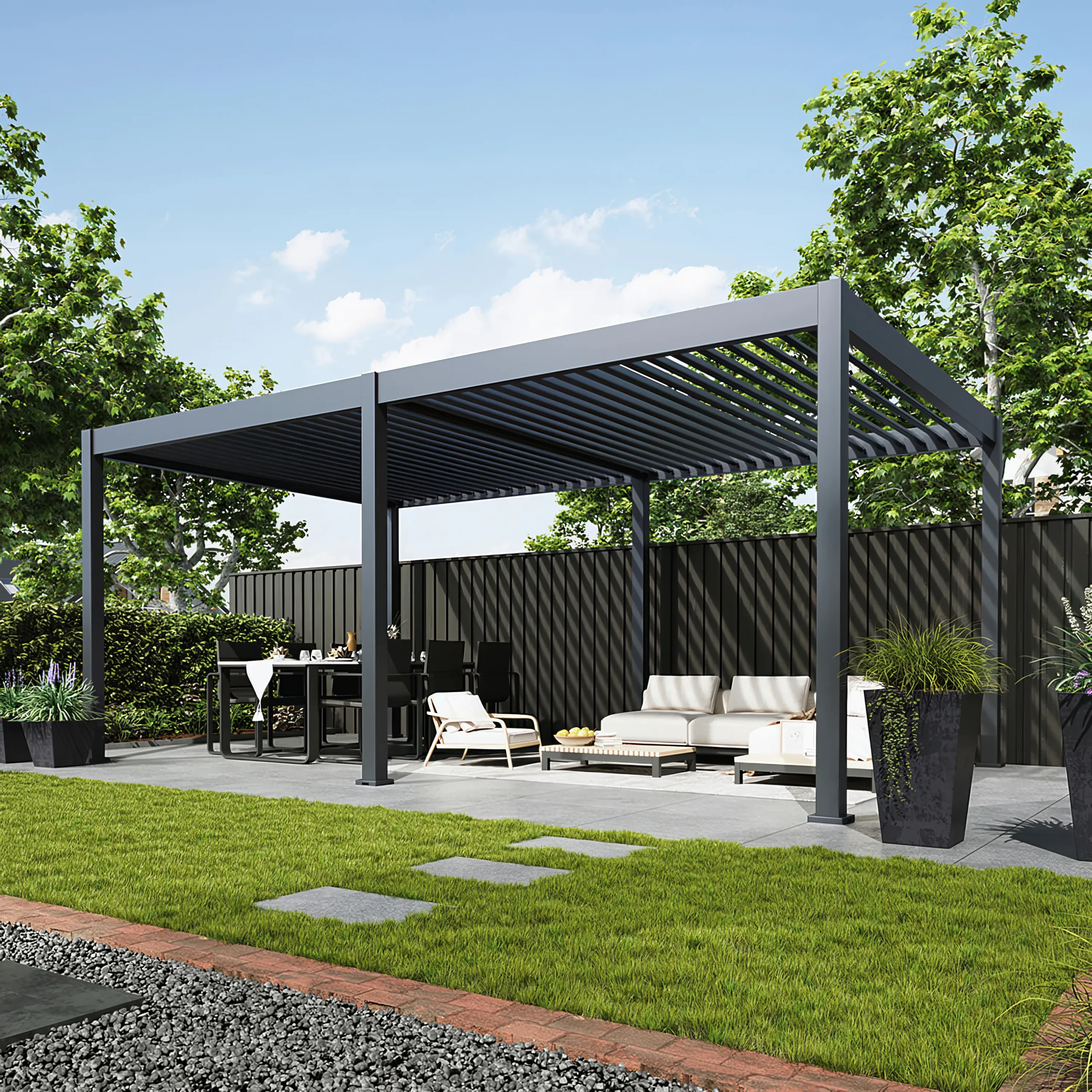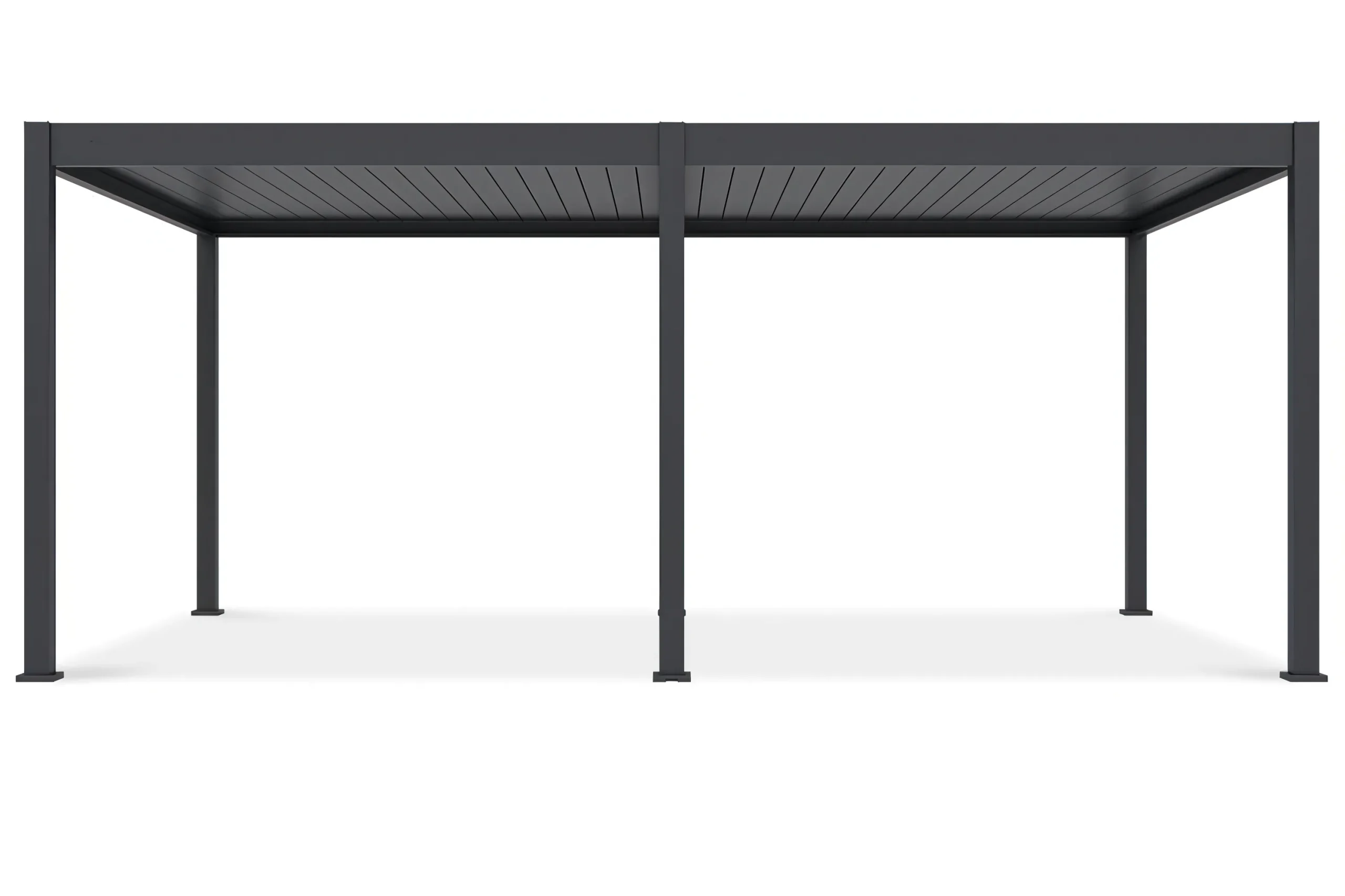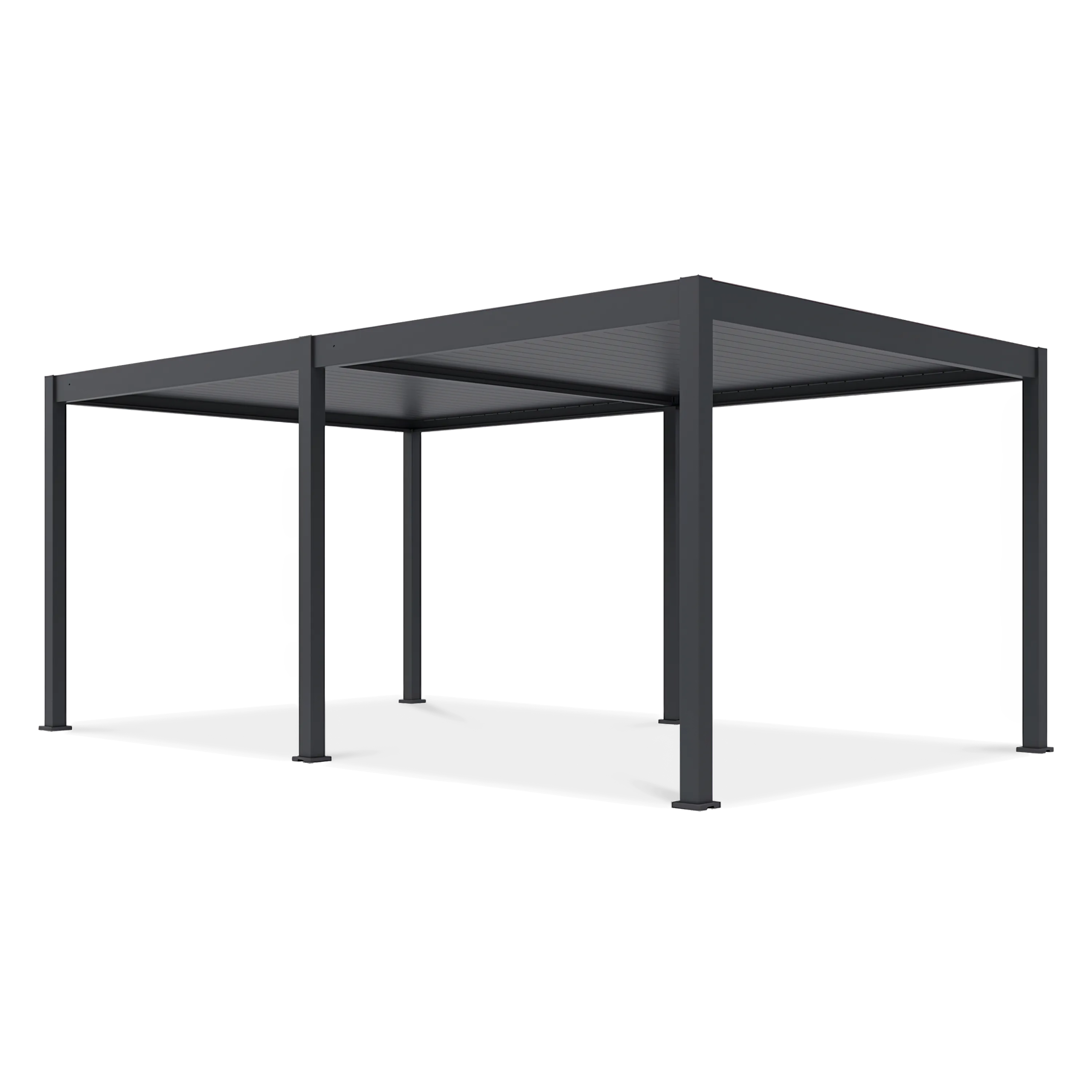 Aluminijasta pergola v antracit barvi se odlikuje po modernem dizajnu in visoki funkcionalnosti. Zahvaljujoč inovativnim funkcijam, kot sta električno nastavljiva streha z daljinskim upravljanjem in vgrajena LED-osvetlitev, lahko svojo teraso uporabljate vse leto. Lamele je mogoče brezstopenjsko nastavljati do kota 135°, kar zagotavlja optimalno prodiranje svetlobe in UV-zaščito. Robustni stebri dimenzij 116 x 116 mm in trpežne aluminijaste lamele zagotavljajo stabilnost in odpornost na vremenske vplive. Ta pergola združuje sodoben dizajn in funkcionalnost in je idealna za vaš vrt ali teraso.