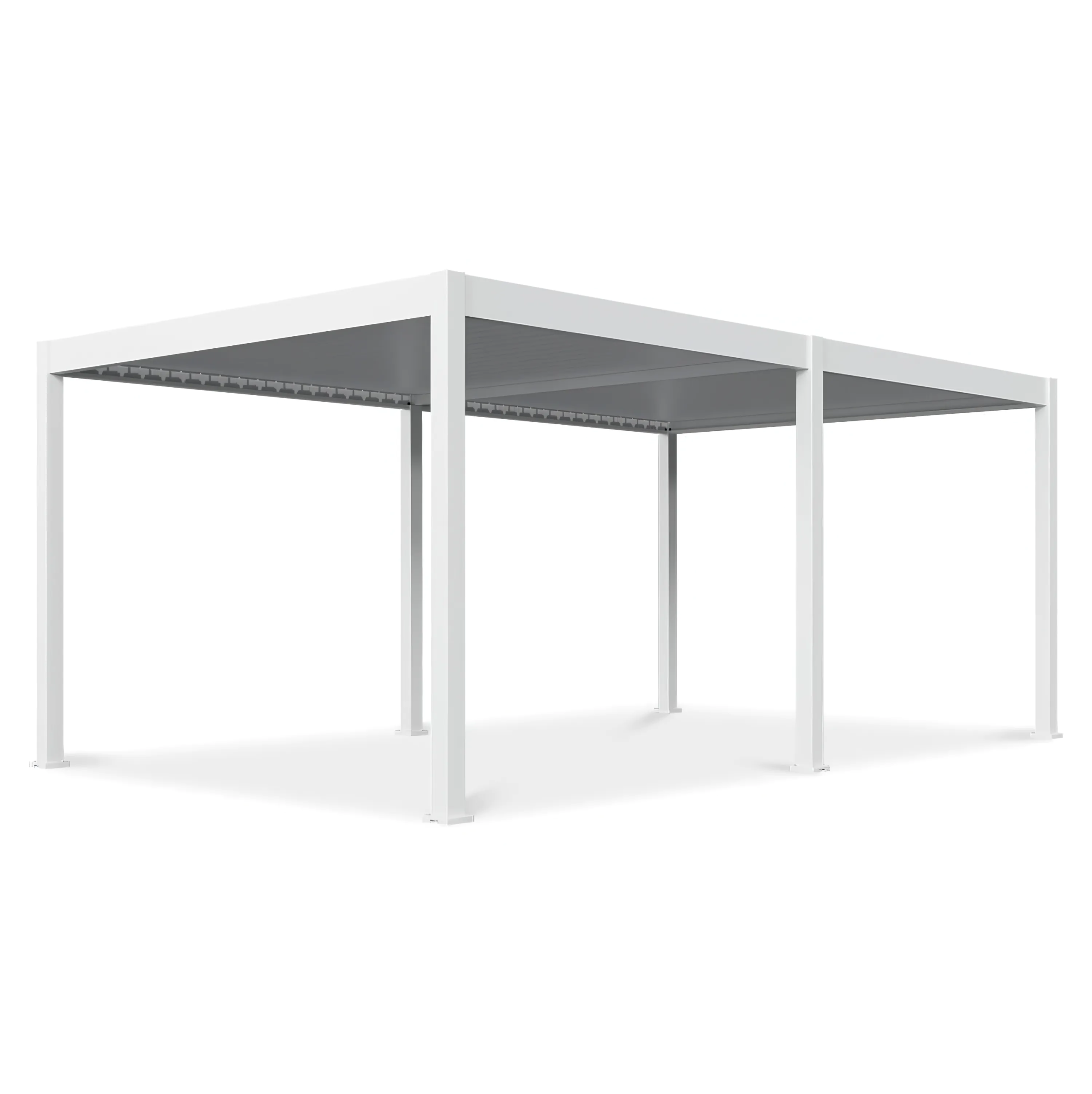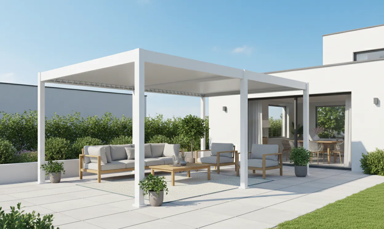 Aluminijasta pergola v beli barvi se odlikuje po modernem dizajnu in visoki funkcionalnosti. Zahvaljujoč inovativnim funkcijam, kot sta električno nastavljiva streha z daljinskim upravljanjem in vgrajena LED-osvetlitev, lahko svojo teraso uporabljate vse leto. Lamele je mogoče brezstopenjsko nastavljati do kota 135°, kar zagotavlja optimalno prodiranje svetlobe in UV-zaščito. Robustni stebri dimenzij 116 x 116 mm in trpežne aluminijaste lamele zagotavljajo stabilnost in odpornost na vremenske vplive. Ta pergola združuje sodoben dizajn in funkcionalnost in je idealna za vaš vrt ali teraso.